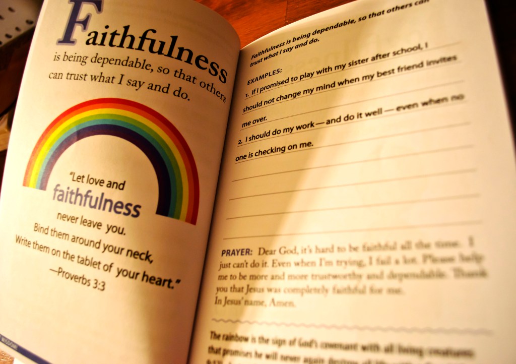 Each colorful two-page spread includes a character trait, its definition, scripture memory, writing space, and a prayer.