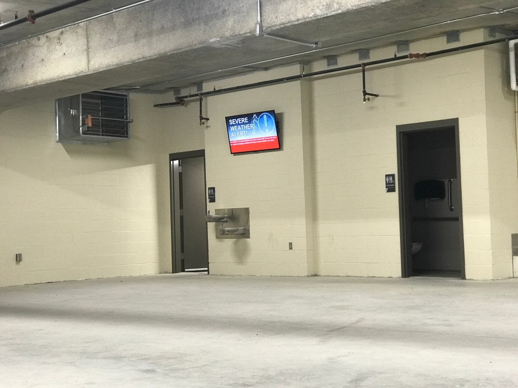There aren’t very many people here at the moment. The first band of storms passed; after which, several people exited. This room is so huge, we have been able to honor the 6ft apart guidelines. There are restrooms, a water fountain, and a screen that updates watches and warnings.